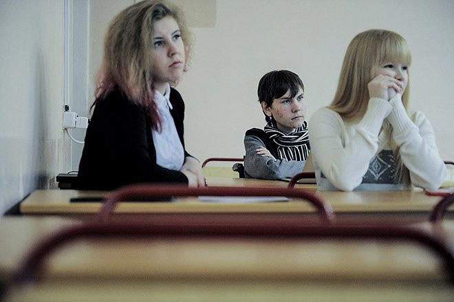 Мы останавливаемся у институтских ворот. Папа Алексей вывозит из машины коляску, сажает в нее Женю, и мы мчимся на пару — опаздываем. Институт — обычное пятиэтажное здание, с пандусом на крыльце, но без лифта. А первая пара — на третьем этаже. Папа поднимает Женю по лестнице — 6 пролетов по 13 ступеней, 45 килограммов в Жене и 4 — в коляске. После второго пролета даже крепкий Алексей останавливается, чтобы передохнуть. В этом году Женя поступил на первый курс Социального института МГПУ на направление «социально-культурная деятельность». Обычно люди на колясках получают высшее образование на дому или в специализированных институтах. «Я сразу сказал, что не пойду в специализированный институт, — говорит Женя. — Я не хочу, чтобы мне делали скидки, я хочу учиться наравне со всеми и получать ту же программу. Я поступал на режиссуру в несколько вузов. В одном со мной всего пять минут поговорили по делу, а потом 25 минут объясняли, почему меня не могут принять. Все сводилось к тому, что я на коляске: «это такая ответственность, мы не можем взять ее на себя». А в МГПУ приняли хорошо. Я даже не подавал документы на льготные места. Это важно для самоощущения — что же я, не мужик, что ли? Что же, у меня таланта нет?» Сцену Женя любит с детства — он поет, ведет концерты, сейчас взялся за свою первую театральную постановку. «Сцена — это пространство, свободное от барьеров, — может, за это я ее и люблю. Для большинства людей бытовые проблемы — как выйти из дома, как сходить в туалет — это ерунда, а выйти на сцену перед большой аудиторией — это адреналин, взрыв эмоций. А для меня наоборот. На сцене я себя чувствую гораздо комфортнее, увереннее, чем в повседневной жизни, когда я не могу передвигаться сам. На сцене я ощущаю себя самодостаточной личностью». Женя единственный студент на коляске в этом институте. Администрация помогла, как смогла: во вторник, пятницу и понедельник группа Жени учится только на первом этаже. В остальные дни однокурсники носят Женю по лестнице. «Не хочешь просить никого — сиди дома, — рассуждает Женя. — Меня это никогда не останавливало». Сегодня вторая пара на первом этаже, Жене нужно спуститься. В его группе всего один парень, но он сегодня не пришел.