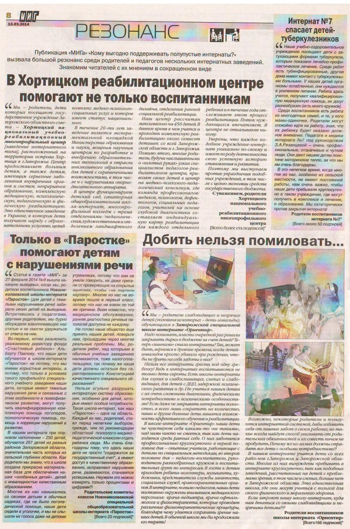Как и ожидалось, публикации затронули за живое директоров интернатов, и многих родителей воспитанников. В «Миге» №8 от 13.03.2014 были опубликованы «возмущённые» отзывы родителей, суть которых в том, что в интернатах детям хорошо, и закрывать интернаты нельзя.