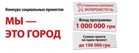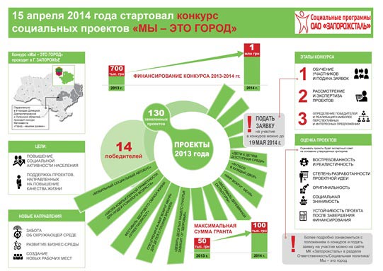 Напомним, в 2013 г. на участие в конкурсе «Мы - это город» запорожцы подали более 130 заявок, из которых победили 14 общественно-социальных проектов. На реализацию 14-ти лучших идей МК «Запорожсталь» выделил гранты - до 50 тыс. грн. каждый, в общей сумме 700 тыс. грн. Наиболее яркими реализованными проектами стали «Мобильный социальный автобус», «Школа компьютерной грамотности для людей пожилого возраста», Фестиваль здорового образа жизни «Street workout» и специализированные тренинги «Мир вокруг меня» для реабилитации детей с плохим зрением.
