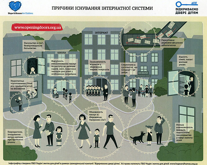 Сьогодні в Україні функціонує понад 700 інтернатних установ 15 різних видів. За радянських часів інтернати будувалися з розрахунку на 300-500 дітей. На сьогодні вони продовжують функціонувати, навіть якщо там залишилося 50 дітей. Доволі часто керівники закладів змушені заохочувати дітей з малозабезпечених сімей, щоб заповнити ці місця в інтернатах. Звідси й маємо результат: 80% з 80 тисяч дітей в інтернатах – це «домашні» діти, тобто такі, що знаходяться в інтернатах тому, що в родинах є проблеми, пов’язані з відсутністю роботи, станом здоров’я, бідністю чи низьким рівнем батьківської компетенції, які не було виявлено та попереджено на початковому рівні. І лише 20% дітей, що перебувають в інтернатах, – це ті, хто має статус сироти чи дитини, позбавленої батьківської опіки. Вся решта могли б виховуватися в сім’ї.