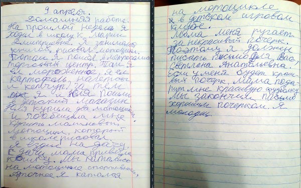 Сначала, конечно, я стояла возле него и подсказывала: «А разве там ты сегодня не был? Напиши!». Потом поняла, что ему необходимо время, пауза, чтобы собраться с мыслями и все вспомнить.