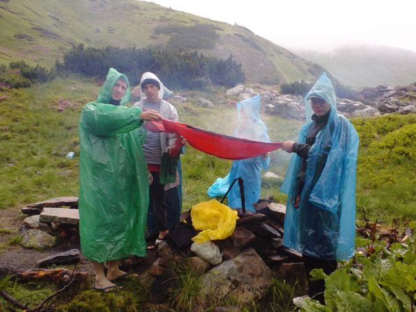 Весьма прохладная погода была сюрпризом для многих детей – температура ночью едва достигала 6 градусов тепла. Несмотря на то, что мы сообщали список необходимых вещей всем родителям, не все отнеслись серьёзно к этой информации – никто не мог поверить, что в середине лета в Карпатах будет столь низкая температура. Пришлось на ночь одевать всю имеющуюся у нас одежду, и в каждую палатку заселять больше детей, чтобы им было теплее. К счастью, утром все смогли согреться у костра и напиться горячего чаю.
