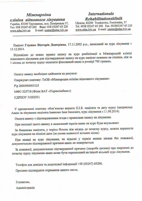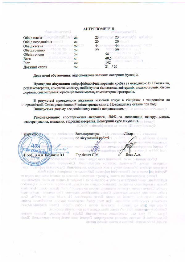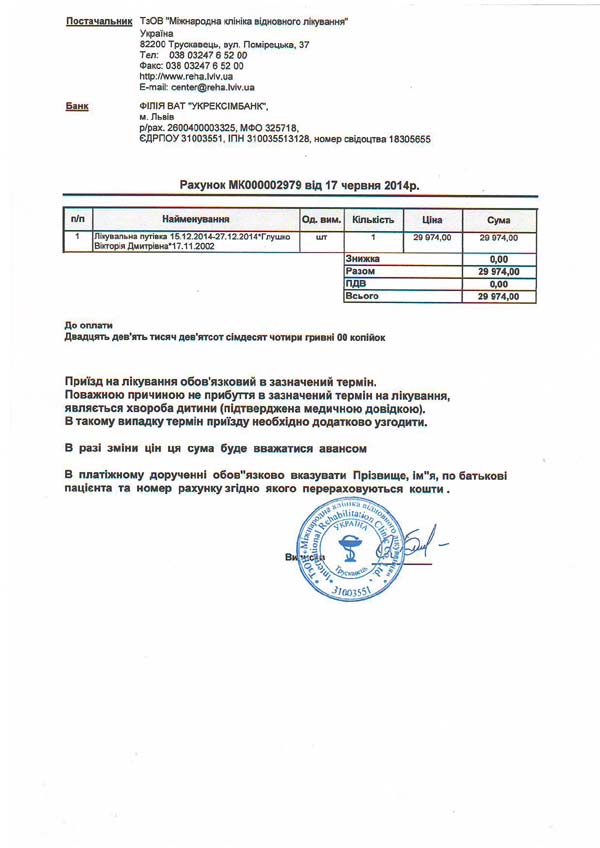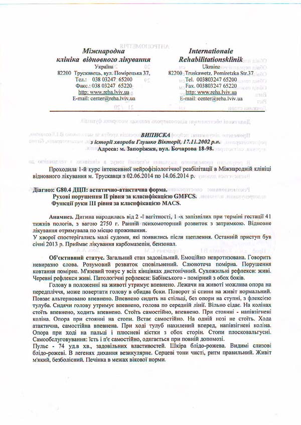 Виктория получает постоянное медикаментозное лечение, а также нуждается в курсах реабилитации в Международной клинике восстановительной лечения по методу проф. Козявкина 2 раза в год. Один курс стоит 30 тыс. грн., в год нужно порядка 60 тыс. грн.
