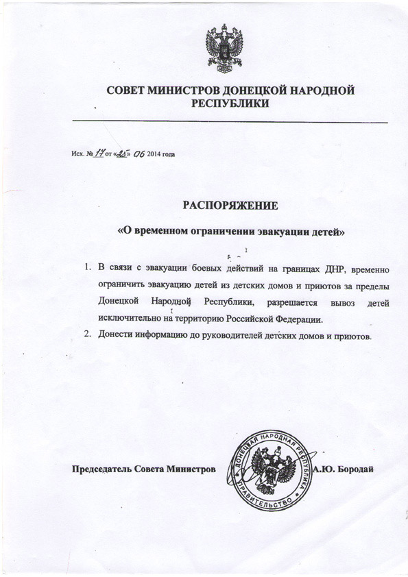 Следует отметить, что всем сотрудникам интернатов, работникам местных и областных администраций, волонтерам и добровольцам постоянно угрожала опасность. Большинство тех, кто так или иначе был причастен к вывозу детей, переживали реальный страх смерти. Чего только стоит "распоряжение совета министров ДНР от 25 июня", за подписью "председателя" Александра Бородая, о запрете эвакуировать детей из детдомов и приютов за пределы "ДНР". Можно — исключительно в РФ. С этой бумажкой простых служащих и работников детских учреждений "ознакомляли" вооруженные "министры". Террористы ночевали в домах ребенка и интернатах. И министерства могут сколько угодно ссылаться на "компетенцию местных органов власти", забывая при этом упомянуть, что последних оставили наедине с чрезвычайной ситуацией отнюдь не регионального масштаба.