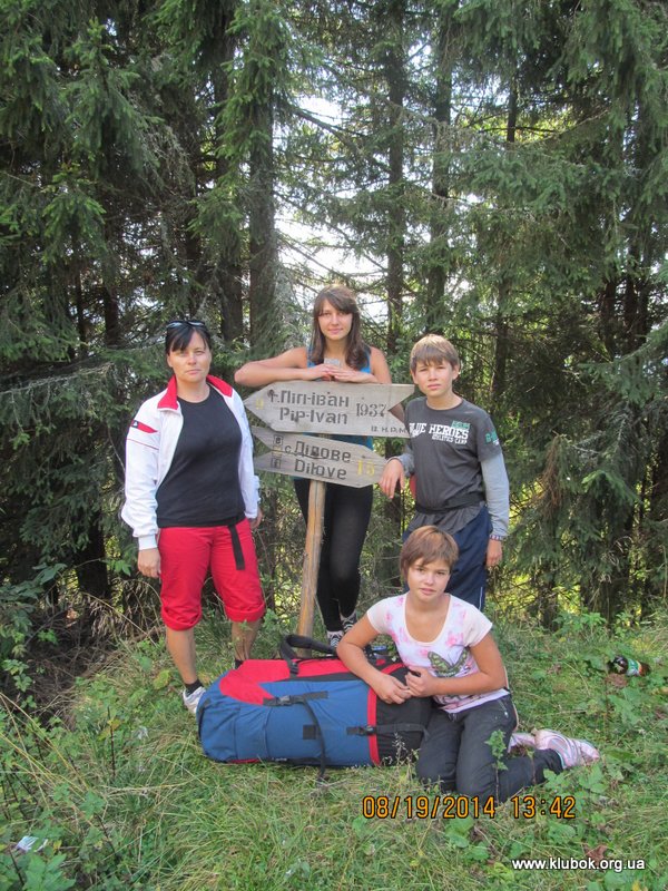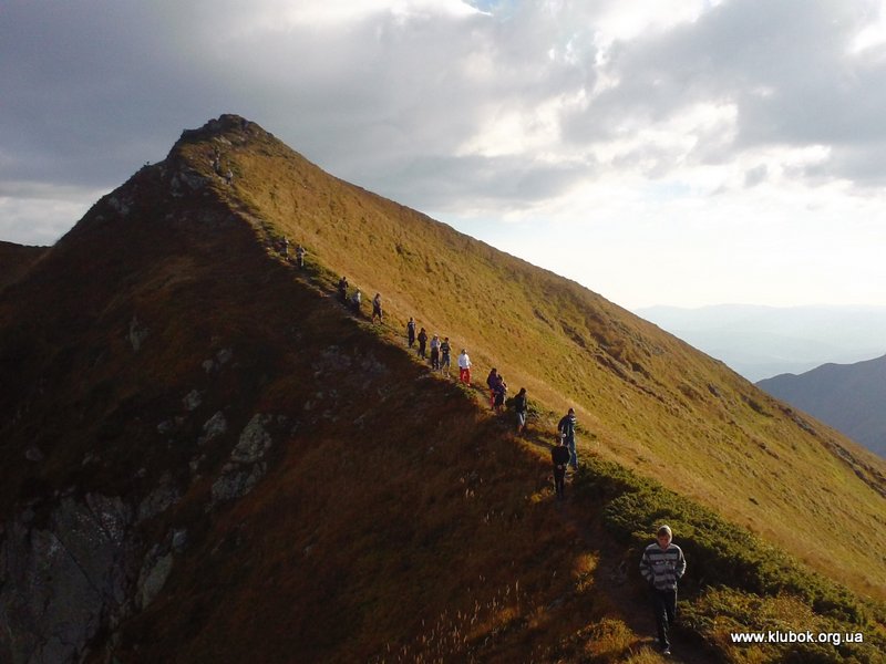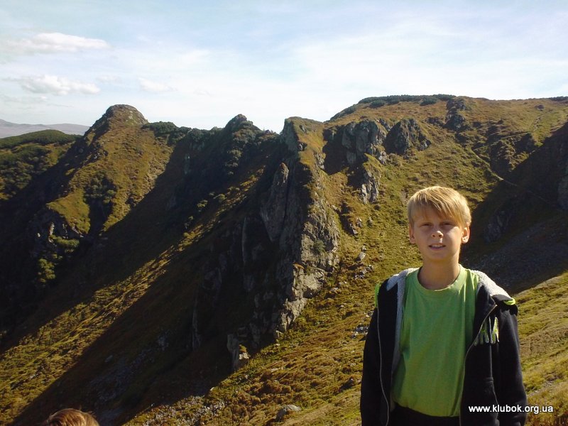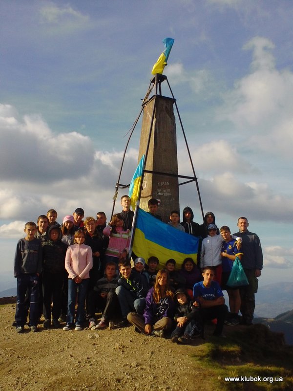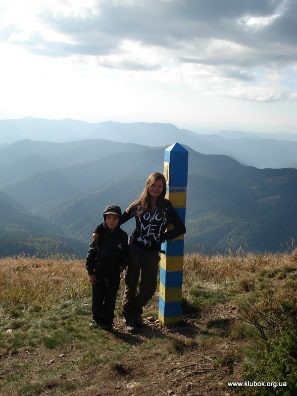 На следующий день, 17 сентября, мы без рюкзаков отправились покорять наивысшую точку Мармарошского хребта – году Поп Иван, высотой 1938 м. Довольно быстро по хорошей грунтовой дороге мы практически подошли к вершине, и думали, что через минут 15 взойдём на неё. Но удивительная табличка с надписью «Внимание, опасный участок» отвлекла нас от правильного пути. В итоге мы пошли вдоль более крутого, сыпучего и скалистого склона горы. В одном месте казалось, что тропа по маленькому хребту легко взойдёт на вершину. Небольшая группа отправилась на разведку тропы, но в итоге убедилась в крутизне и опасности подъёма, и вернулась назад. Сделать решающий рывок к вершине мы решили чуть дальше, по довольно крутому, но безопасному травянистому склону. Это восхождение запомнилось детям надолго. Хотя опасности падения вниз не было, но при затяжном подъёме приходилось цепляться руками за траву и кусты. От высоты у некоторых голова шла кругом. Наконец-то все забрались на вершину, на которой был установлен каменный знак, увешанный украинскими флагами. По этой же вершине проходила граница между Украиной и Румынией. Детей очень удивило, что граница с Евросоюзом особо никак не выделяется – отсутствует забор, лишь пограничные столбики установлены на расстоянии около километра друг от друга. Без карты и GPS легко случайно оказаться в Румынии, за что можно поплатиться немалым штрафом и выдворением из страны. Вдали, километров в 40 на юго-восток на румынской территории виднелась высокая гора, визуально выше Говерлы – скорей всего, это румынская гора Пьетрос (2303 м). Дети спрашивали меня – «А почему мы не можем пойти дальше? В Румынии ведь тоже красивые места , и горы ещё выше?!».
