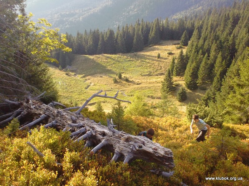 С горы Поп-Иван мы спустили коротким путём, по той самой тропинке, которую мы не заметили утром. На полонине Лисичей пообщались с лесниками, живущими в небольшом деревянном домике. Они поведали нам, что в этом районе много кабанов, иногда заходят из Румынии медведи и волки.