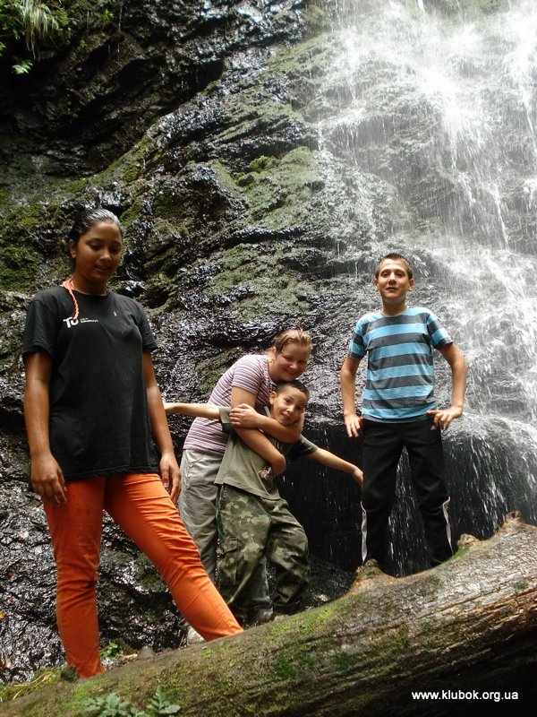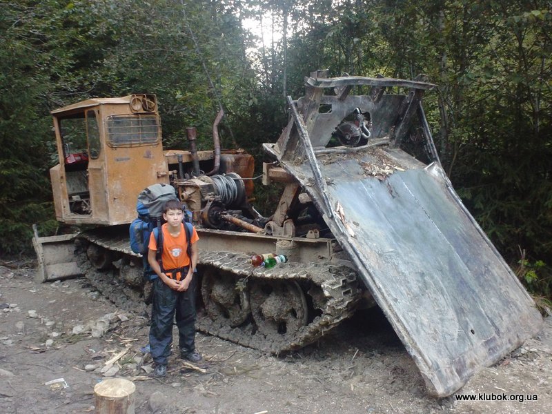 На следующий день нам предстоял спуск в село Костыливка. Решив сократить путь, мы пошли по небольшой лесной тропе, и в результате упёрлись в труднопроходимый бурелом на крутом склоне. Но ребята не растерялись перед очередным испытанием. Они поверили в свои силы и ничто уже не могло остановить их. За полчаса мы, изрядно уставшие, выбрались из бурелома на нормальную дорогу. По такой дороге дети чуть ли не бежали, не чувствуя веса рюкзаков. Спуск был затяжным, 14 километров по долине реки Берлебаш. Местами дорога превращалась в месиво, с колеёй глубиной почти метр. Наконец, мы дошли до стоянки-беседки на берегу речки, в нескольких сотнях метров от села Костыливка.