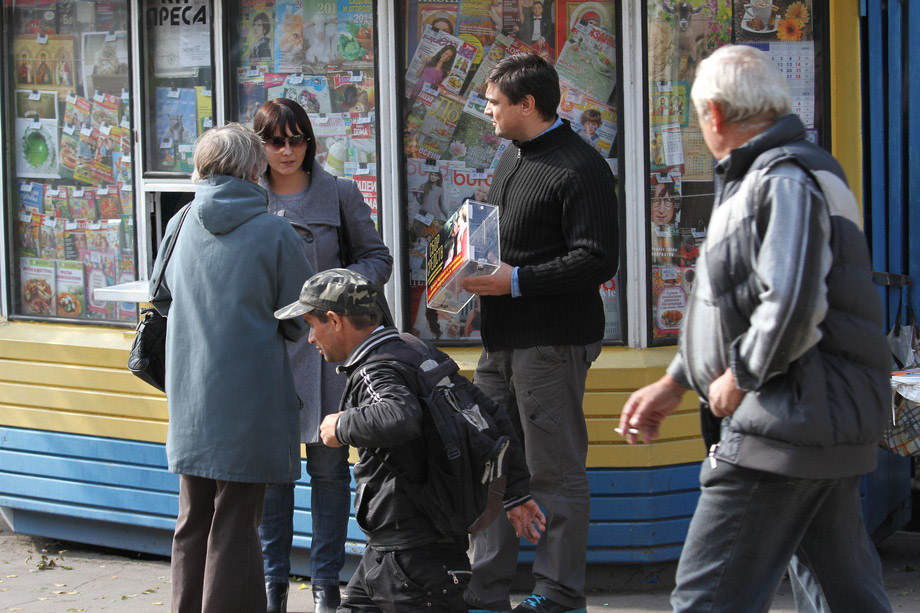 Первым на такой призыв подошел молодой светловолосый паренек. Он «поковырялся» в кошельке, перебирая купюры, но таки решил, что три гривны — сумма подходящая. Без всяких расспросов молодой человек опустил эти деньги в наш стеклянный лоток и ушел. Через десять минут «откликнулась» женщина старшего возраста.