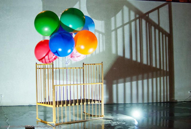 Біля входу відвідувачів зустрічала іржава колиска, в якої прогнило дно, ? символ системи інтернатів, та сім кольорових кульок ? надія на те, що нарешті ця система полетить у повітря і про виховання дитини в інтернаті українці більше не згадуватимуть.