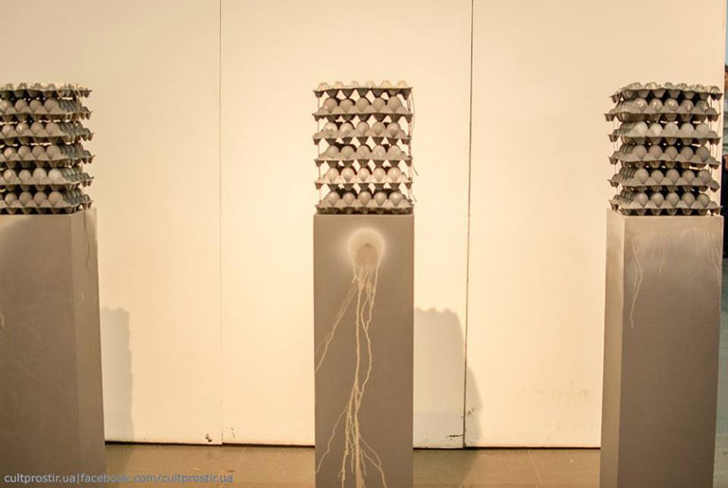 На виставці також було декілька інсталяцій. Наприклад, 400 сірих яєць – всі однакові, однак мають обмеження – кришку й дно. Яйця, які знаходяться під світлом, різні, незвичайні та індивідуальні. Вони відрізняються один від одного, але розвиваються, сповнені світлом та теплом.