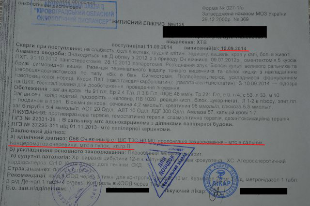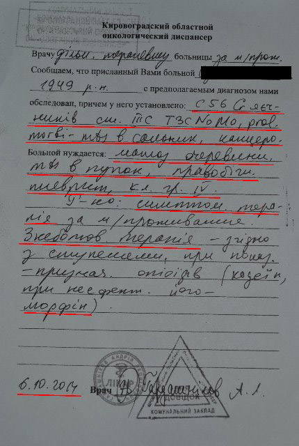 - Моя бабуся була смертельно хворою. Ми з лікарями боролися за її життя стільки, скільки могли, але прийшов час, коли варто було готуватись до найгіршого. Не тільки психологічно, а й формально. Ті, хто лікував бабусю вонкодиспансері, розповіли, що ми маємо зробити, коли її серце зупиниться. Ми хотіли, щоб після смерті бабусю перевезли до моргу Кіровоградського онкологічного диспансеру (тим паче, що ми живемо неподалік від нього), тому що саме там, як ніде, знали що саме потрібно робити з тілом померлої. Нам сказали: бабуся у такому стані, що проблем із визначенням моргу, а тим паче реєстрацією смерті, не буде. Це підтвердив і терапевт, який бачив бабусю за кілька днів до смерті і зробив відповідний запис у її картці, щоб ми потім показали його в міліції. Проте, коли це сталось, представники правоохоронних органів практично без слів видали довідку про необхідність перевірити чи бабуся померла своєю смертю. Хоча ми мали всі необхідні документи, які, до речі, є відповідями на кілька пунктів їх постанови. Вони простовідмовилисяїх подивитися. Бабуся помирала дуже страшно. Вона втратила дуже багато крові (через тяжку стадію гінекологічного раку), яка не зупинялась і після смерті. І замість того, щоб нормально підготувати тіло покійної допроводів в останній путь у моргу за кількасот метрів від нашого будинку, її закривавлене тіло «протрусили» нашими прекрасними дорогами аж на селище Нове. Добре, що ми вчасно отримали довідку про смерть і нам вдалось уберегти бабусю від розтину — знущання над її змученим від хвороби тілом.