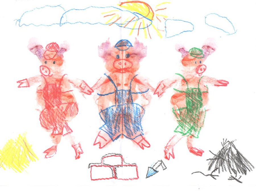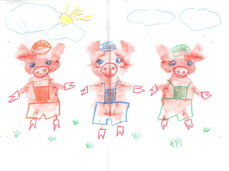 Как же изобразить трёх весёлых поросят? Давайте сделаем это с помощью монотипии. Помните, как рисовать бабочку, складывая лист бумаги пополам? Вот и сейчас мы сложим альбомный лист вдвое и подготовим акварельные краски. Нам потребуются только красные оттенки; их необходимо смочить водой с помощью кисточки. Теперь развернём лист и прямо в центре нанесём два овальных пятна, а сбоку — два круглых. Нам необходимо, чтобы при повторном складывании пятна слились и подготовили силуэты для трёх фигурок маленьких поросят. Постарайтесь, чтобы из пятен вышел не тест Роршаха, а именно поросята. Теперь допишем детали — уши и ножки, время от времени прижимая одну часть листа к другой, добиваясь тем самым симметричности пятен. Завершающим этапом будет прорисовывание глаз, копыт, элементов одежды и окружения сказочных героев.