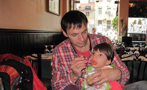 Десять дней жизни в непривычной среде: ни мы, ни окружающие — не чувствуем себя ни неловко, ни виновато. Жизнь как жизнь. Один успешный, другой немощный, обычные дела. При этом хороший тон состоит в том, чтобы максимально сгладить эту разницу, а не расширить. Мы чувствуем себя полноценными, нам уютно, надежно, мы не за кадром. Просто у нас еще и коляска, контейнер с протертой едой, резкие движения и необычные звуки. Мало ли, кто и что с собой носит.