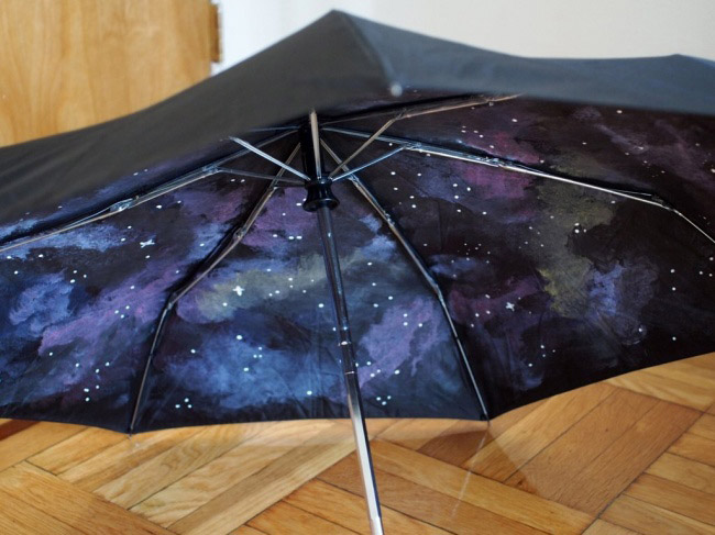 Снаружи зонт совершенно черный, но стоит его открыть, и вы окажетесь среди Галактики, полной мерцающих звезд. Сделать такой зонт не так уж и сложно — все, что понадобится, это краски и немного вдохновения.
