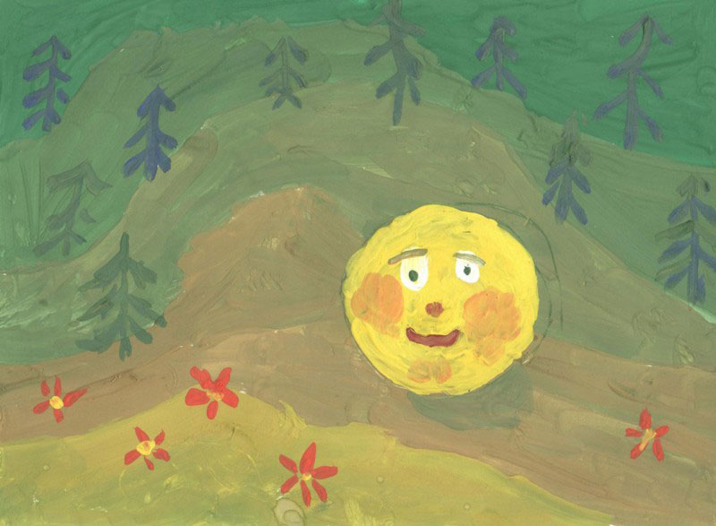 Когда фон хорошо подсохнет, начертим Колобка обратной стороной кисти и закрасим это пятно жёлтой краской. Дальше остаются мелочи — глаза и рот Колобка, елочки, цветочки и прочие детали, какие подскажет фантазия. Для этого потребуется маленькая кисточка. Вот и покатился Колобок!