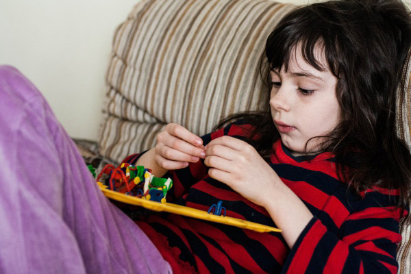 Оля веде мене до Галинчиної маленької кімнатки: з одного боку ліжко, до якого боком притулилася шафа, обклеєна кольоровими наклейками, письмовий стіл, полиці й тумба – навпроти, засипані навчальним приладдям. Серед усього тут багато засобів для розвитку моторики й сенсорних відчуттів. Мама Галі показує мені спеціальні пружинисті кільця.