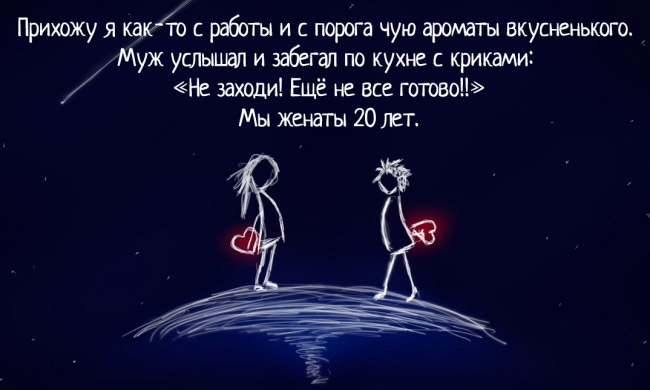 Сегодня, после того как мы 2 года прожили раздельно, мы с моей бывшей женой наконец-то утрясли наши разногласия и решили встретиться за ужином. Мы болтали и смеялись четыре часа напролет. А перед тем, как уходить, она отдала мне большой, пухлый конверт. В нем лежали 20 любовных посланий, которые она написала за эти два года. Конверт был подписан «Письма, которые я не отправила из-за своего упрямства».