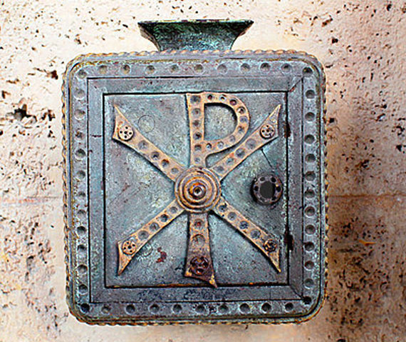 Кованный ящик для сбора пожертвований с анаграммой Христа