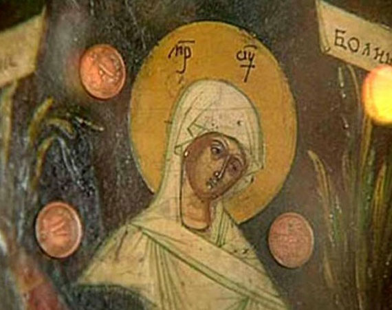 «Всех скорбящих Радосте и обидимых Заступницы (с грошиками)»; фрагмент иконы из Троицкого храма («Кулич и Пасха») у Невской заставы (Санкт — Петербург)