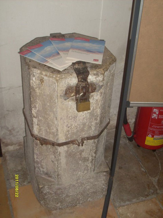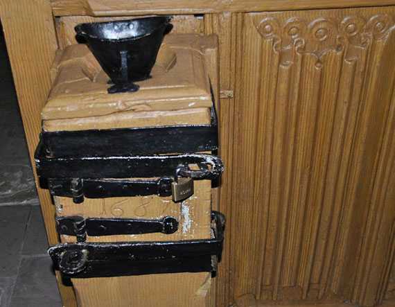 Эта «стационарная» копилка для пожертвований, вытесанная из камня где-то между 7 и 9 веком, находится в католическом храме св. Руперта (Вена, Австрия). Щель для пожертвований стыдливо прикрыта туристическими буклетами