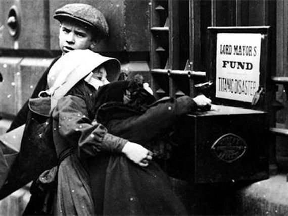 Дети у ящика для сбора пожертвований пассажирам и членам экипажа «Титаника», выжившим после крушения (1912 год, Нью-Йорк)