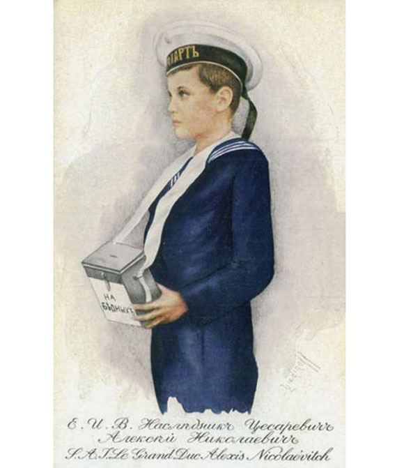 Почтовая карточка «Сбор пожертвований в пользу бедных», с изображением Его Императорского Высочества Наследника Цесаревича Алексея Николаевича с ящичком для сбора пожертвований ( нач. 20 века)