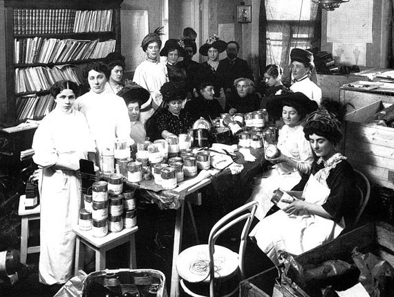 Члены благотворительного общества по улучшению быта детей за приготовлением кружек для сбора пожертвований «На борьбу с детской смертностью» (Петербург, 1910-е гг.)
