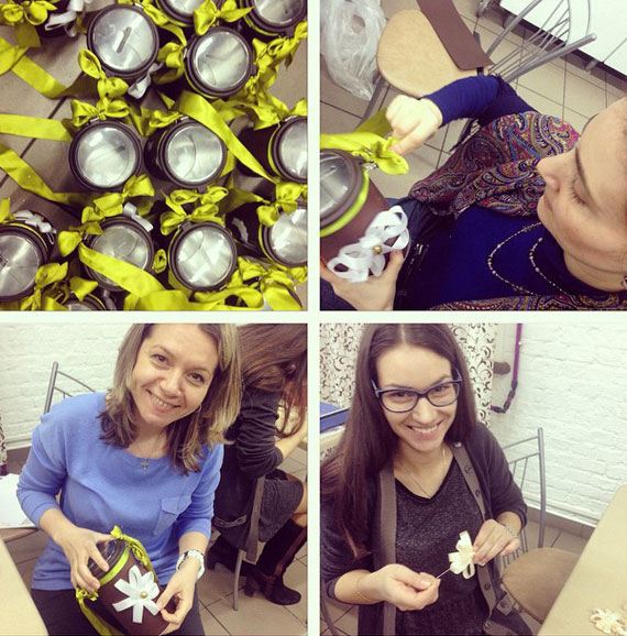 Добровольцы православной службы «Милосердие» за приготовлением кружек для благотворительных пожертвований в рамках празднования «Белого цветка» в стенах Марфо — Мариинской обители сестёр милосердия; 2015 год