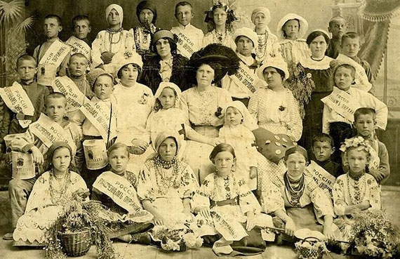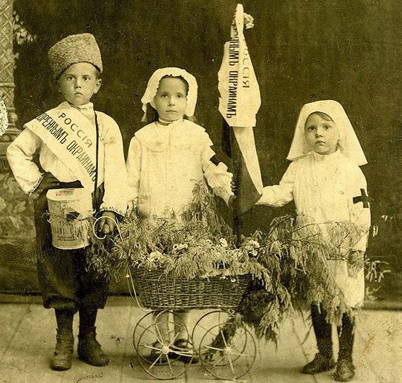 Дети с кружкой для сбора пожертвований в пользу подопечных Российского общество Красного Креста беженцев из разорённых в Первую мировую войну окраин Российской империи