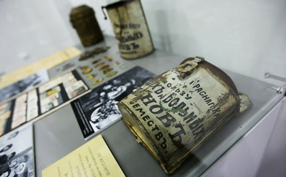Кружка для сбора пожертвований на стенде выставке, посвящённой благотворительной деятельности во время Первой мировой войны