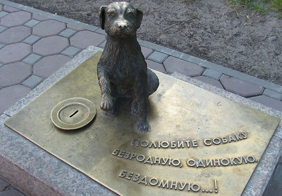 Эта скульптура бездомной собаки (Екатеринбург) одновременно и элемент, формирующий городскую среду, и благотворительная копилка. Все деньги, которые люди пожертвуют в пользу бездомных собак и кошек, будут регулярно изыматься из копилки представителями благотворительного фонда помощи бездомным животным.