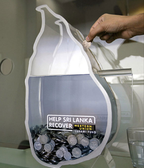Стеклянный ящик для пожертвований в Фонд помощи Шри-Ланке (после разрушительного цунами в 2004 году) выполнен в форме контуров самой страны