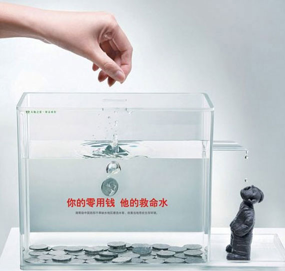 Стеклянный ящик для пожертвований, который превращает каждую монету в каплю воды, стекающую в рот нуждающемуся. Разработка китайского креативного агентства Mccann Heaith Care. Эта акция призывает жертвовать деньги на строительство каналов и резервуаров в засушливых районах Западного Китая.