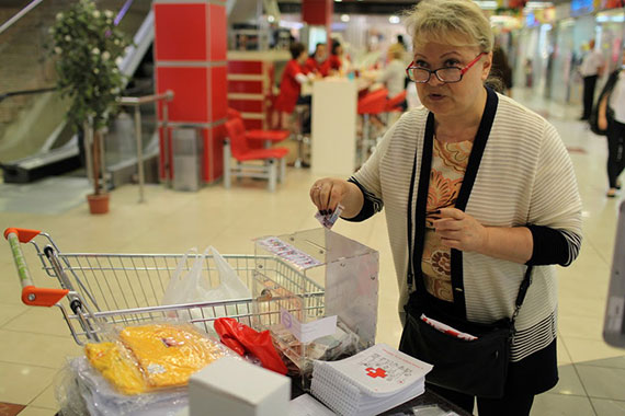 Ящик для сбора пожертвований православной службы «Милосердие» минималистически прост: это опечатанный прозрачный куб с щелью для денег и символикой «Милосердия» или акции, к которой приурочен сбор.