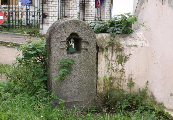 Каменная копилка для благотворительных сборов (18 век, Осташков) у церковных врат.