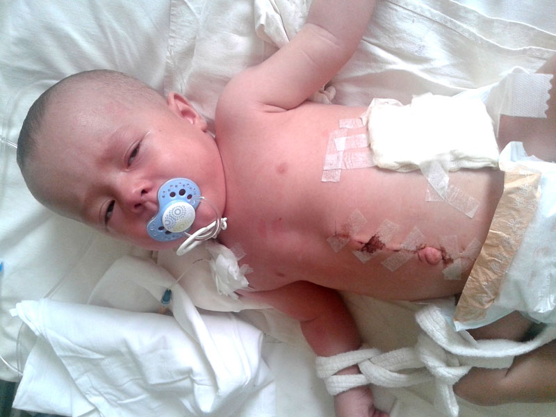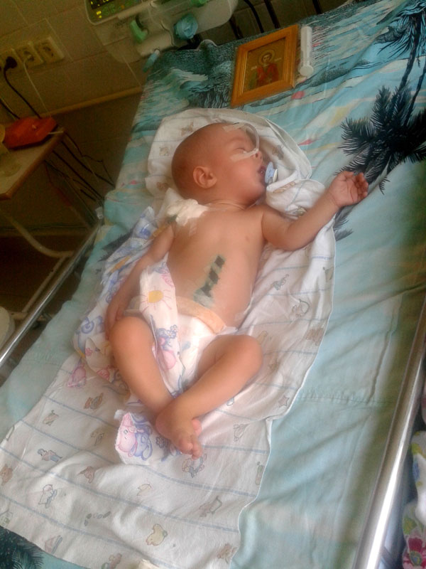 Выписывались мама с Лешкой почти в 3 месяца и, казалось бы, что посещать больницы уже достаточно. Малыш прошел четыре курса реабилитации по неврологии. Денег катастрофически не хватало, притом, что у родителей есть еще шестилетний Ванечка. Бабушки и дедушки помогали настолько, насколько это было возможно. И вот в очередной раз перед следующим курсом у Алеши поднялась температура до 40 градусов, были рвоты с кровью, на скорой малыша доставили в 5 детскую больницу, где решили срочно делать операцию, в ходе которой удалили селезенку, устранили заворот средней кишки. Была проведена гастростомия, операция Пациора, прошивание вен пищевода, спленэктомия, дренирование брюшной полости.