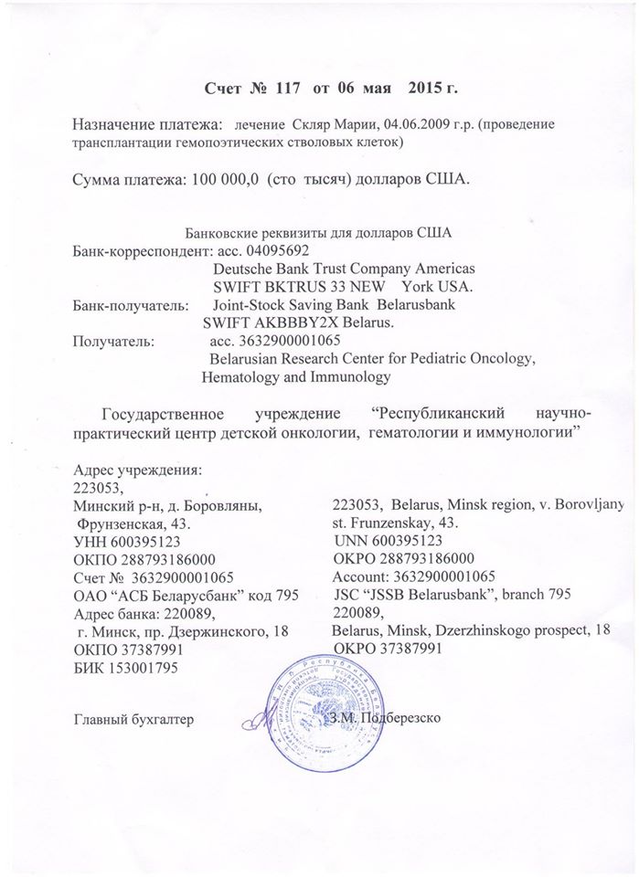Потом беседовали с планово-экономическим отделом центра - через 2,5 месяца на счету у центра должна быть предоплата в 100 000 долларов за трансплантацию. счет ТКМ. Сейчас на счету в центре 32 200 долларов. Мы не можем предположить, как они будут расходоваться, ведь состояние Мани не стабильное, только Господь Бог. Какие процедуры, с какими медицинскими препаратами и сколько их - зависит от состояния Маши.