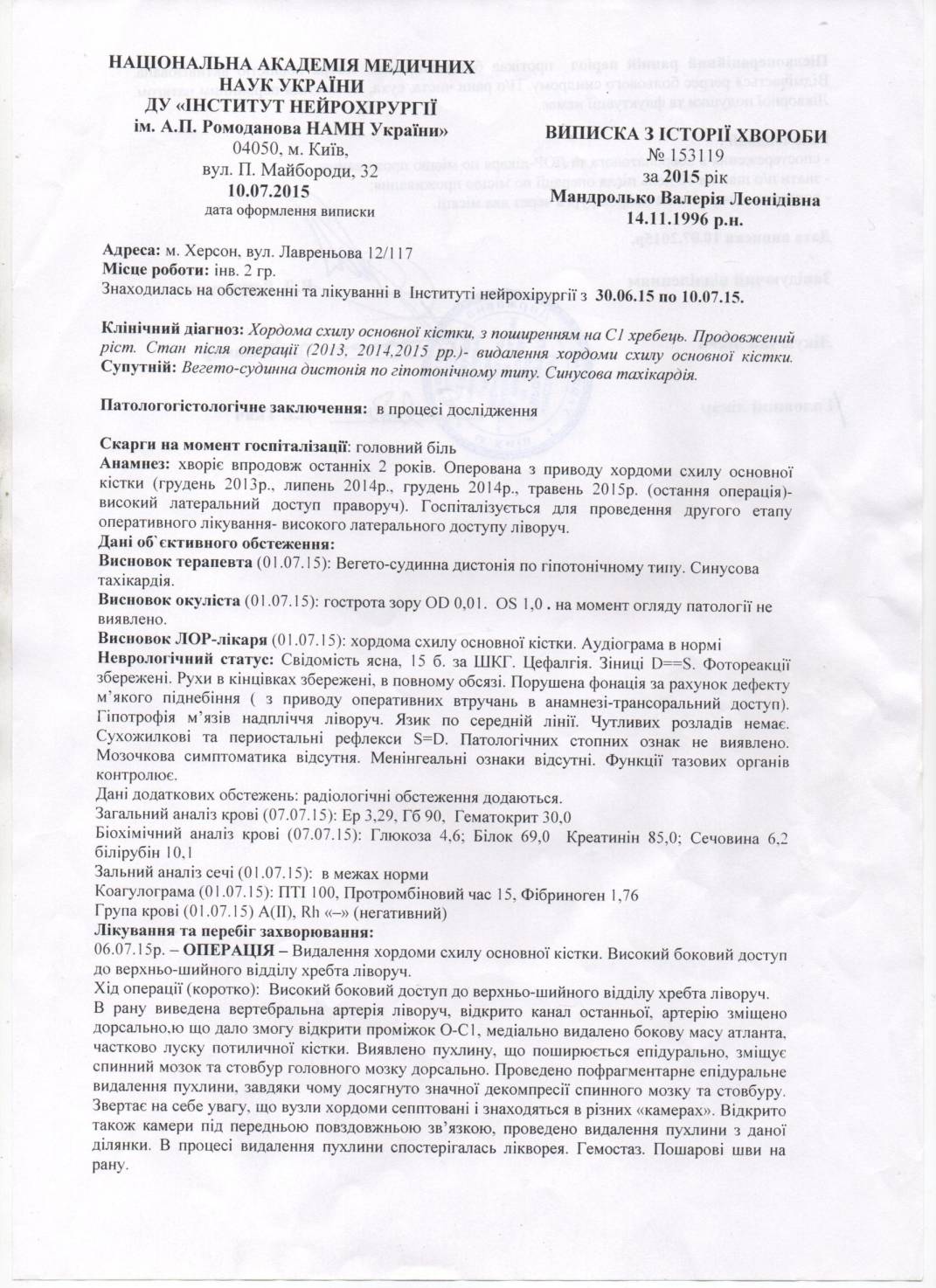 «Меня зовут Валерия, в 2014 году мне был поставлен диагноз «Хордома склона основной кости с распространением на С1 позвонок». Все началось с болей в области левого глаза, при поворотах головы, сжатия плечей и болей в голове. Я была направлена в Институт Нейрохирургии г. Киева! Там мне провели 6 тяжёлых операций. Ожидалось, что будет улучшение, но НЕТ! Отправили меня, по государственной программе лечения за границей, в Германию г. Мюнхен. В Мюнхене мне провели еще 5 операций + протонную терапию в течении 5-ти месяцев.