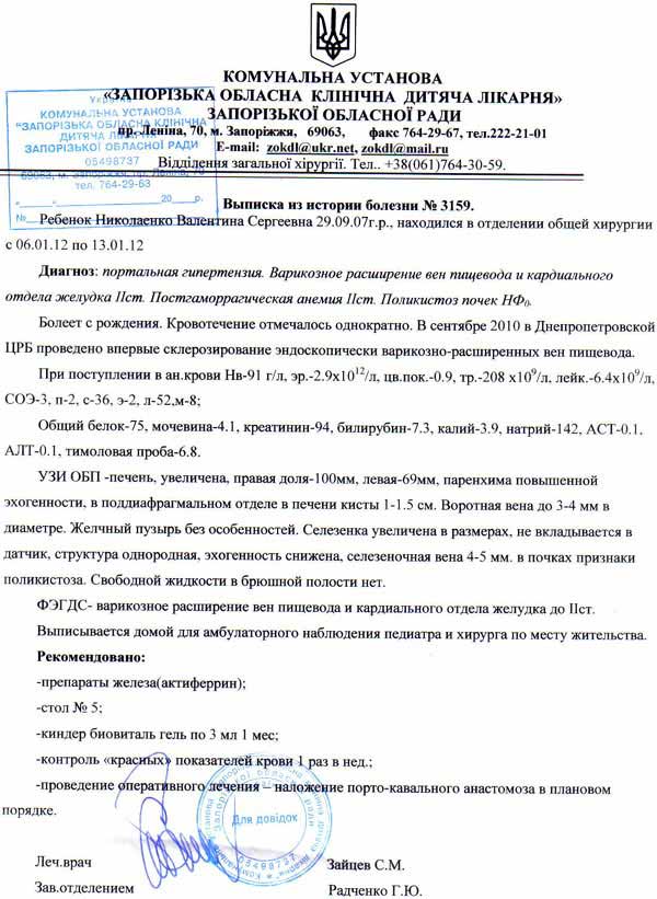За 5 лет жизни ей немало пришлось пережить. С того момента, как девчушке поставили страшный диагноз, началась тяжелая и длительная борьба за победу над недугом. Реанимация, склерозирование вен пищевода в Днепропетровской клинике, а затем тяжелая и сложная операция в МДКГБ №13 им. Филатова.