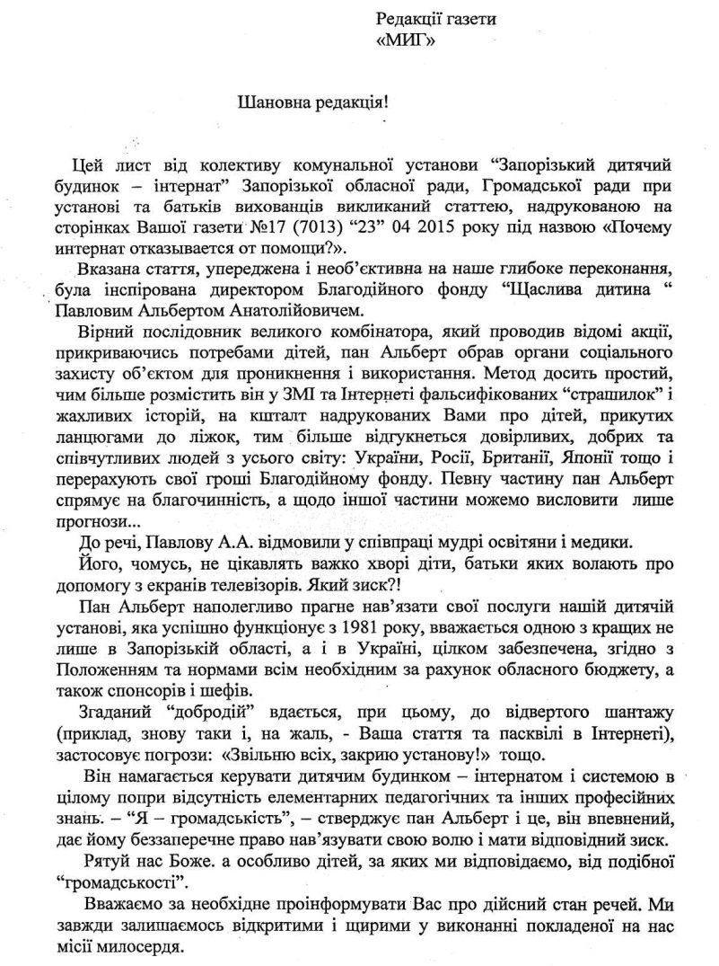 По моему мнению, это ярчайший пример демагогии и клеветы. После этого не могу себе представить, что люди, которые это написали эту ложь, имеют право руководить интернатом