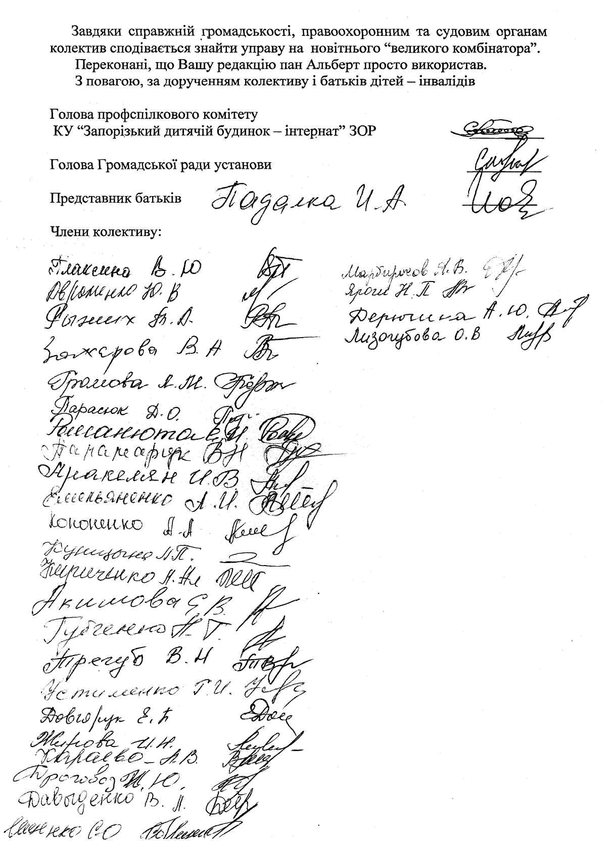Я приведу текст письма, подписанного коллективом интерната (думаю, что основная роль в написании этого документа принадлежит директору заведения Людмиле Гончаренко):
