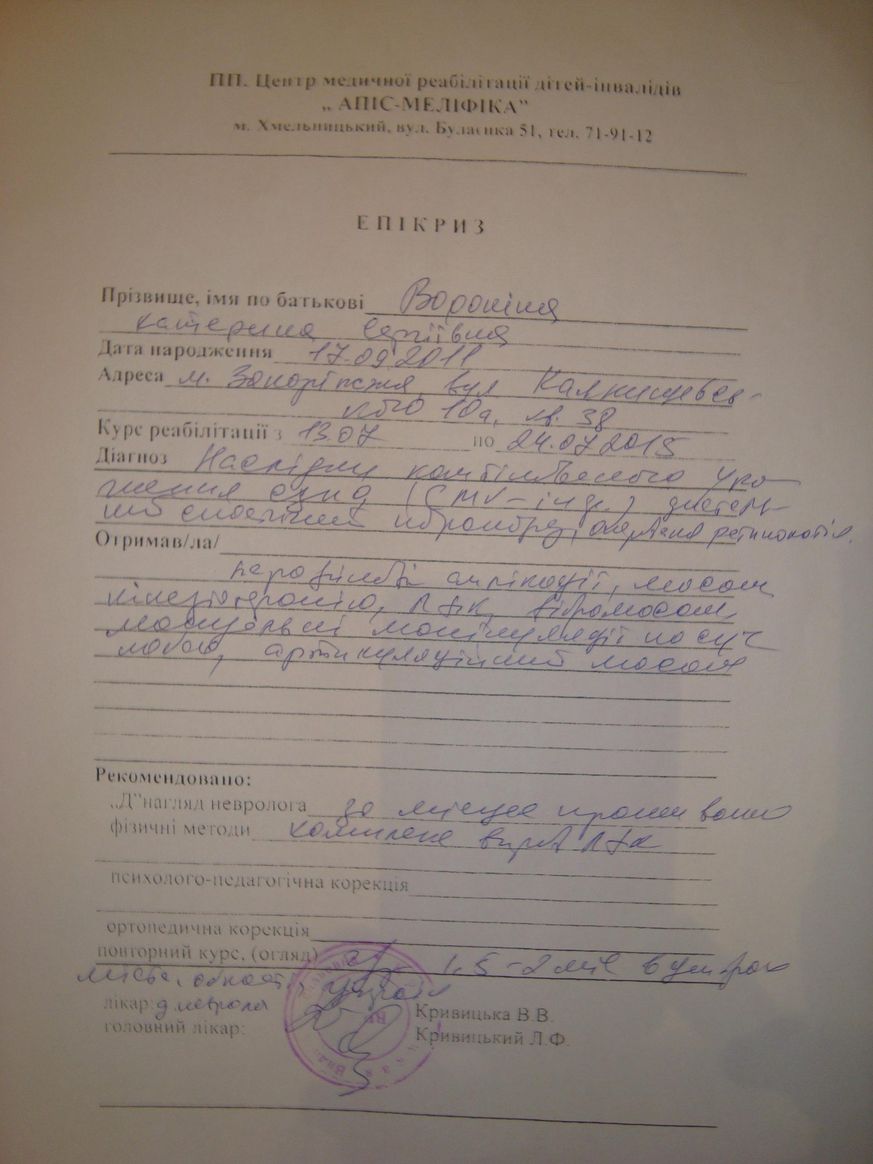 Мы обращаемся к Вам, наши добрые и преданные друзья, помогите нам собрать необходимую сумму для прохождения следующих курсов лечения, чтобы Катюша смогла самостоятельно ходить. Для прохождения следующего курса в центре "Апис-Мелифика", города Хмельницкий нужно 6 000 гривен. У семьи, к сожалению, такой суммы нет…