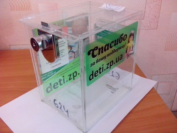 На фронтальной либо тыльной панели бокса обязательно размещается листовка с указанием организации, которая проводит сбор пожертвований – Благотворительный фонд «Счастливый ребенок». На некоторых указаны адрес сайта deti.zp.ua, контактный телефон, реквизиты фонда. Часть емкостей собирает пожертвования для конкретных детей. На таких емкостях размещены фотография и имя ребенка, для которого собираются средства.