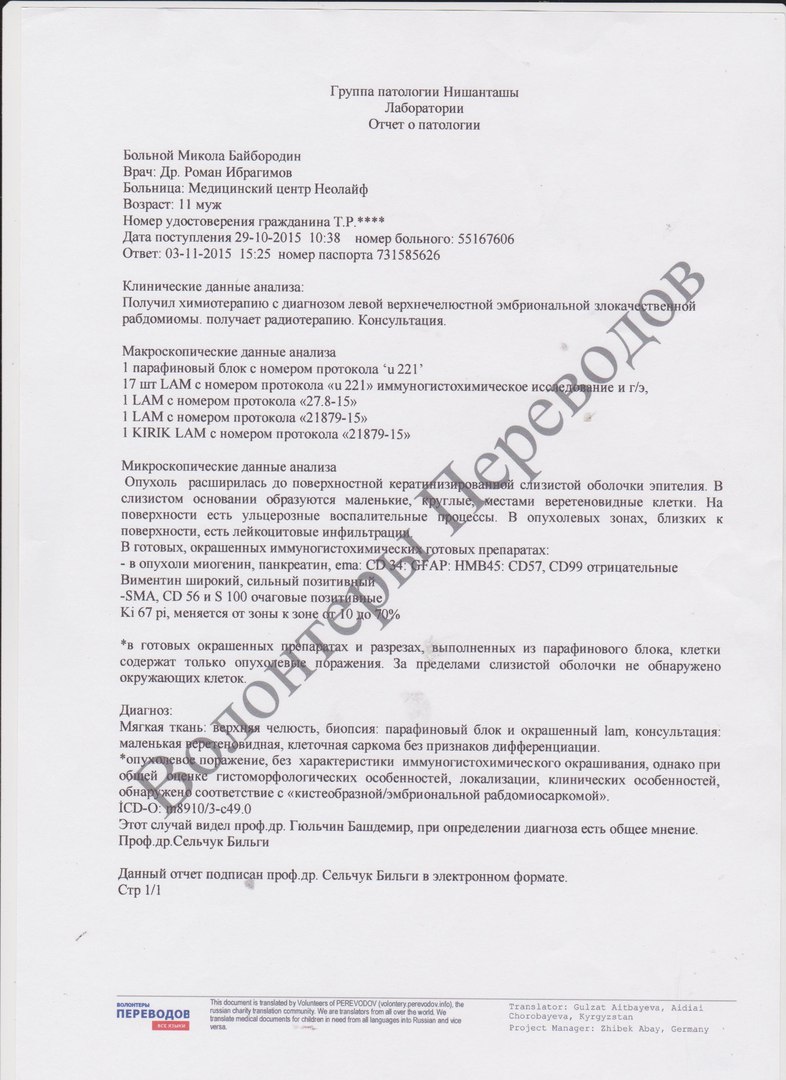 В ЗОКДБ нас посмотрел врач стоматолог–хирург и сказал, что требуется консультация онколога. 9 января, тот самый страшный день, нас осмотрел онколог и отправил на томографию, следом была биопсия. Земля уплыла из под ног, когда мне озвучили диагноз сына эмбриональная рабдомиосаркома - РАК.