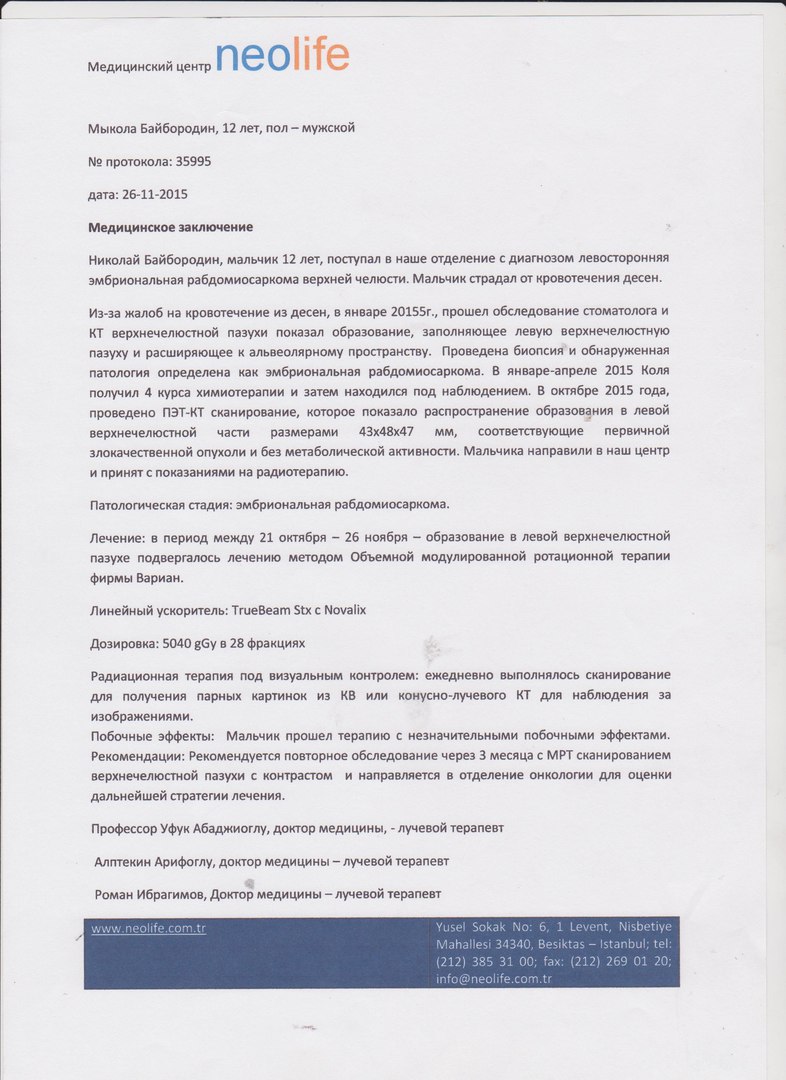 Мы разослали документы в клиники мира, которые специализируются в данной области и получили приглашение из клиники Турции "Неолайф" (Стамбул). С большим трудом, с миру по нитке, благодаря отзывчивым, добрым людям и заграничным фондам оплатили лечение в клинике. Коля прошел обследование и курс качественной радиотерапии на линейном ускорителе. Турецкие врачи дают хорошие шансы на жизнь моему ребёнку. Но для закрепления результата проведенной радиотерапии в Стамбуле, необходимо следовать протоколу лечения, который был выдан нам с выпиской.