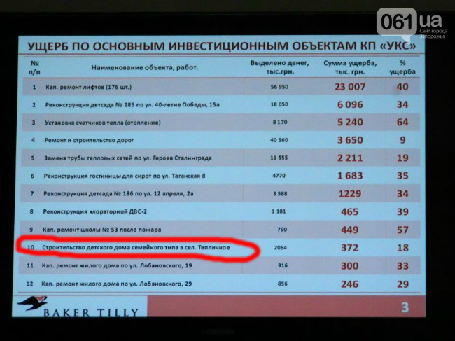 9 февраля 2016 в Запорожье были презентованы результаты аудита КП "Управление капитального строительства", заказчика строительства. На одном из слайдов указан ущерб, нанесенный УКСом по этому объекту - 372 тыс. грн из уже выделенных 2 млн. 64 тыс.