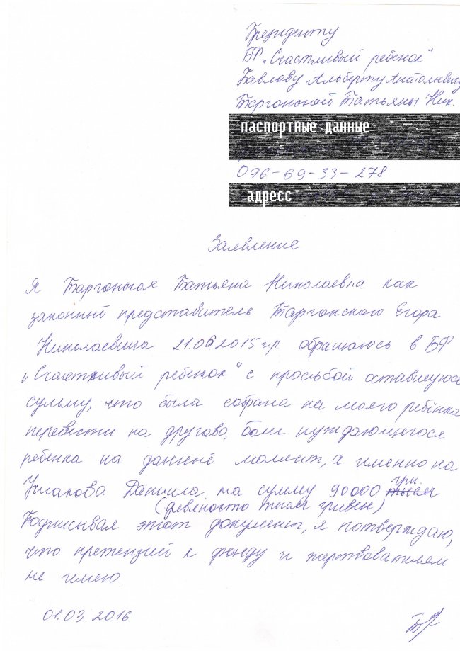 Вчера, 01.03.2016 г. Татьяна Таргонская написала заявление в благотворительный фонд «Счастливый ребенок», о переводе собранных пожертвований, собранных на лечение ее ребенка, на другого, более нуждающегося ребенка, а именно на Ушакова Данила