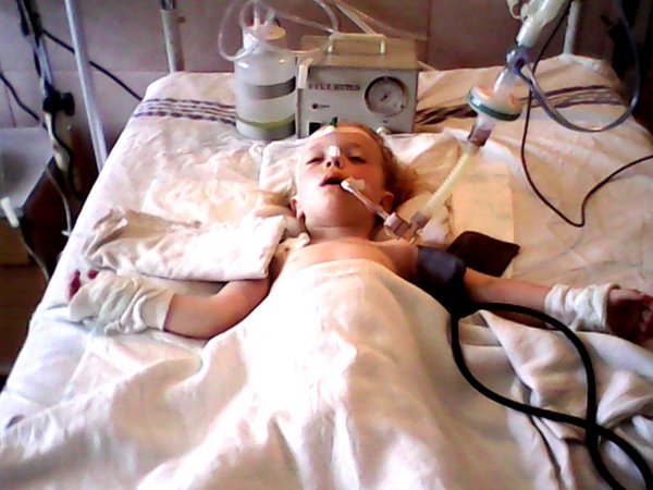 09.04.2016г. у Софийки отказали легкие, появилась стенокардия сердца, начало подыматься давление до 180-200. Назначили терапию имуноглобулиновых преператов «Биовен Моно» и антибиотики, препараты от стенокардии и давления. Ребенок находился все это время без сознания, изредка приходя в сознание на несколько секунд. Малышка продолжала находиться без сознания еще 14 дней, и врачи решили сделать ей операцию - трахеотомию.