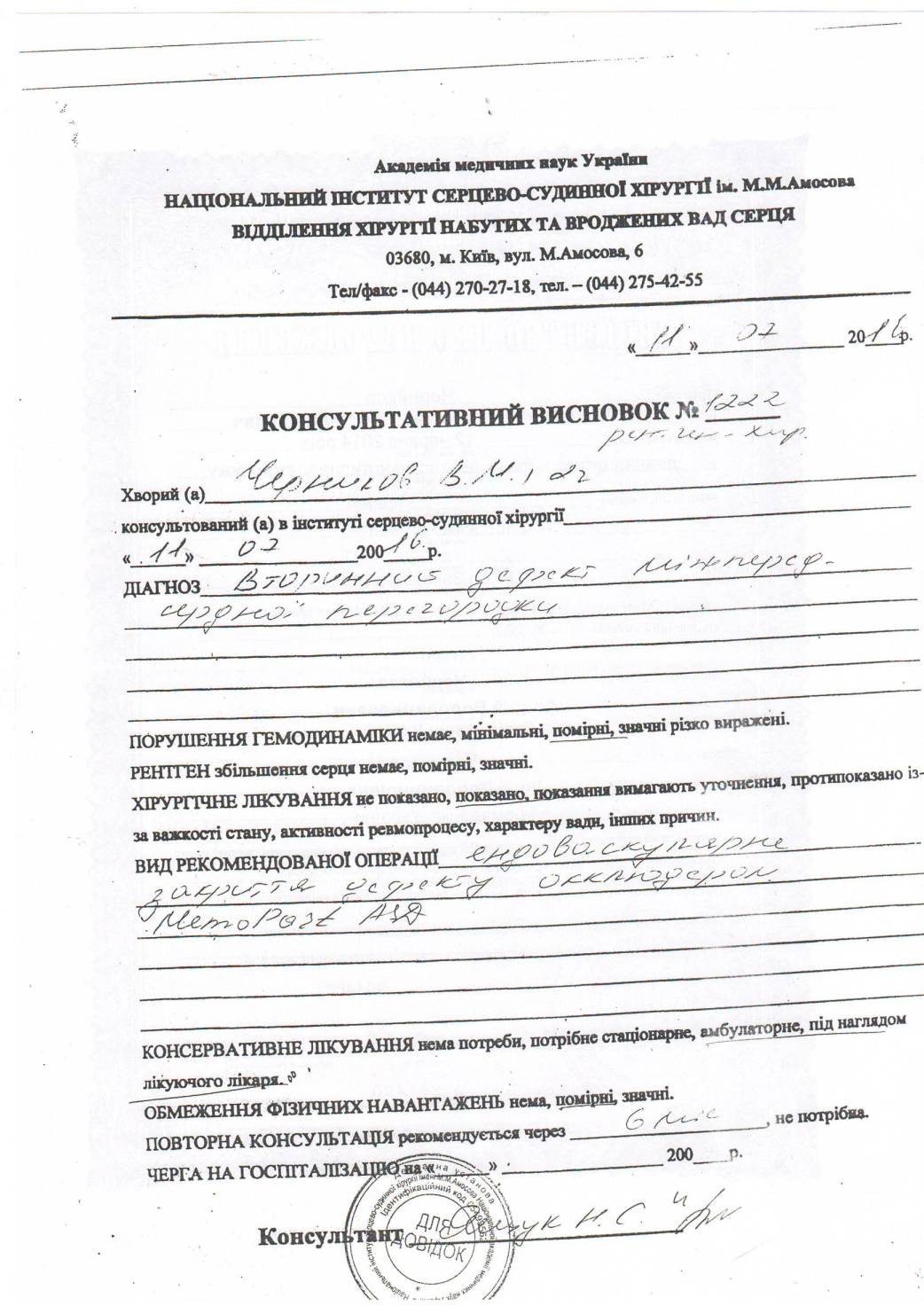 Время шло, Вовка плохо набирал вес, медленно рос. Инна очень переживала и решила, спустя полгода посетить кардиоревматолога. Как оказалось медикаментозное лечение не дало никаких результатов и улучшений, а наоборот – состояние ребенка ухудшилось. В срочном порядке малыш был направлен в Киевский национальный институт сердечно-сосудистой хирургии имени Амосова. Киевские врачи подтвердили диагноз и настаивают провести операцию на сердце в сентябре 2016 года. Перегруженные кровью правый желудочек и правое предсердие увеличиваются в размерах, что приводит к нарушению работы сердца, развитию сердечной недостаточности и различных аритмий. Для проведения операции малышу, необходим окклюдер, его стоимость 95 497 гривен. Инна и Андрей обычная семья, оба работают, но собрать такую огромную сумму на приобретение дорогостоящего микроустройства им, к сожалении, не под силу.