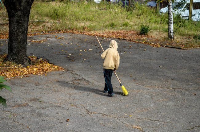 Старое двухэтажное здание из кирпича, на стенах непонятные надписи. Во дворе – детская площадка и много опавшей желтой листвы. Мальчик лет шести подметает асфальт.